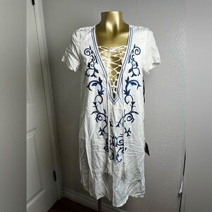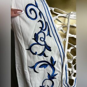 Elegant white midi dress with blue floral embroidery. Features a lace-up neckline. Perfect for casual outings.