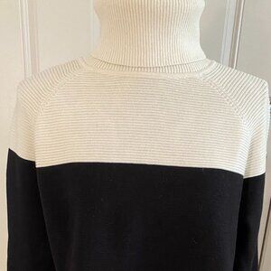 This black and cream colored sweater has a turtleneck, long sleeves with a zippered pocket on one sleeve.
