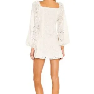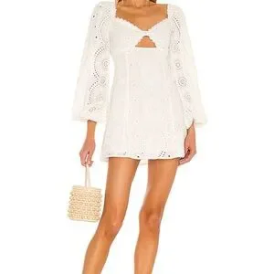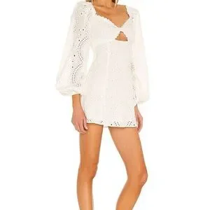 Chic mini dress with eyelet details. Features puff sleeves and a cut-out front. Perfect for stylish outings.
