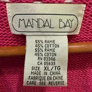 This vintage Mandal Bay sweater vest is a unique addition to any wardrobe. The pink color and beaded design make it a great choice for casual occasions. The sweater is made from a comfortable blend of ramie cotton. The XL size and regular fit make it suitable for a range of body types. The sweater was made in China in the 1990s and has an original design.