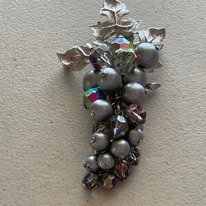 Vintage Brooch Silvertone Grape Cluster gray pearl beads iridescent beads 2.5”