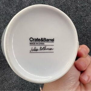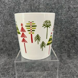 Preowned Crate & Barrel Yule Christmas Trees by Julia Rothman 16oz Coffee Mug / Cup. This mug measures approximately 4” tall x 3.75” wide. No chips or cracks on the outside just some minor shelf wear on the bottom and a small amount of staining on the inside seam.