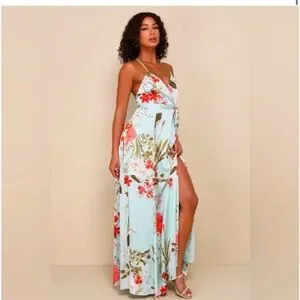 NWT Lulus Still the One Sage Green Floral Print Satin Maxi Dress