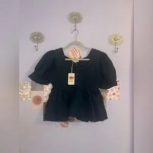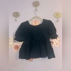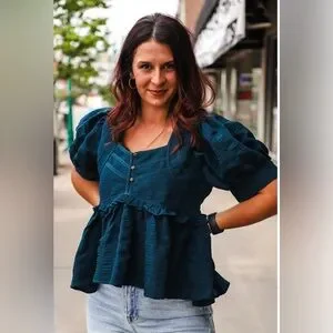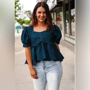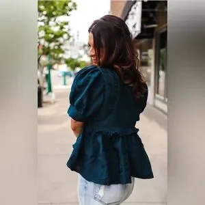 Chic teal blouse by Entro. Features puff sleeves and button details. Perfect for casual outings.