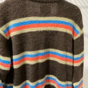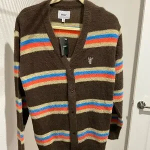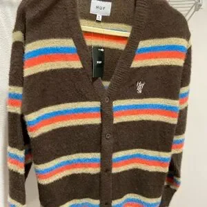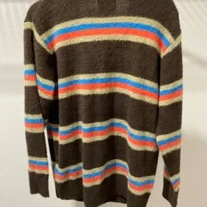 Cozy cardigan with colorful stripes. Features button closure. Perfect for layering.