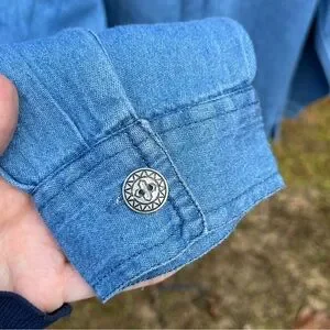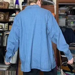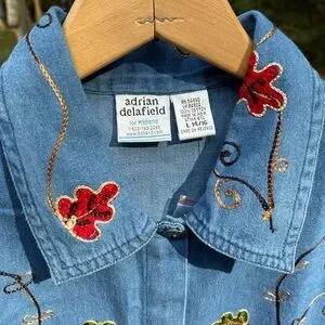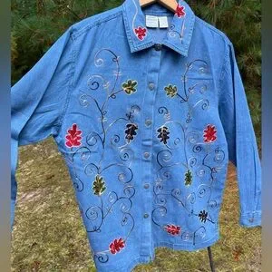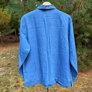 Vintage 90s or y2k 2000s deadstock new with tags nwt denim button-up shirt by Haband. Love the metal silver-toned buttons and leaf embroidery on the front! Wear open as a light jacket or buttoned up. Button cuffs. Brand is Adrian Delafield for Haband. 100% cotton jean / denim is super comfy like a chambray. Tagged Women’s size L 14/16 fits like a L/XL modeled on a S/M 34B 5’5”. Bit big on me, but fits nice and oversize if I wear it open over a T-shirt. Unisex. No noticeable flaws.