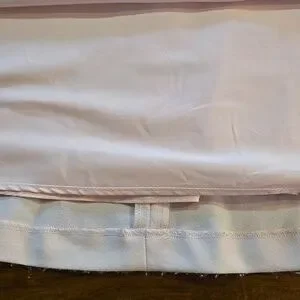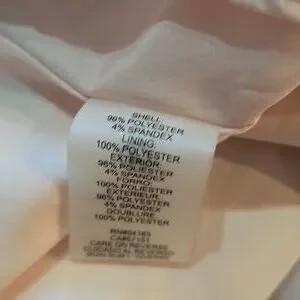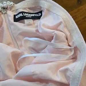 Karl Lagerfeld pink gown. Features elegant pearl-accented adjustable straps. Zips up the back. Size 12. Very good pre-owned condition. No stains or holes, but there is some light fuzziness around the hem from dragging on the floor and very minimal pilling under the arms. Neither will be visible while worn. There are some light dirt stains on the back along the hem.Please see photos. Dry clean only. Dress is fully lined and has a light stretch to it. Length is approximately 61 inches. Gorgeous dress for a wedding guest, bridesmaid, prom, or other formal event.