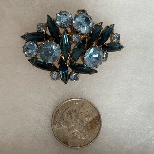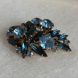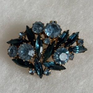 A beautiful brooch featuring 2 types of blue rhinestones.