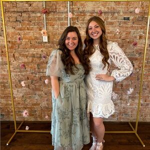 Elegant green dress with floral pattern. Features sheer sleeves and ruffled hem. Perfect for any occasion.