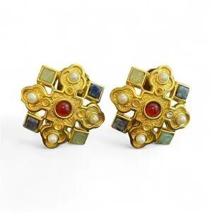 Vintage Maltese Cross Multicolor Stones & Pearls Clip Gold Tone Clip Earrings