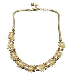 Vtg Signed Trifari Necklace Choker Faux Pearl Clear Rhinestone Gold Tone 13.5"