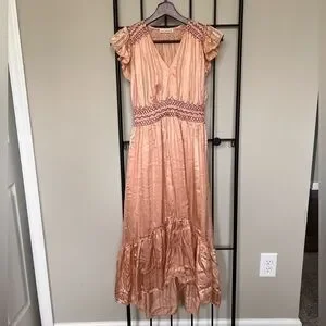 Gorgeous, peach colored, v neck, cap sleeve, satin dress by designer Ulla Johnson. Size 0. Invisible side zipper. Midi length. Brand new, never worn. No tags.