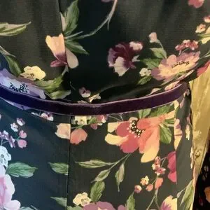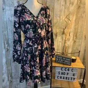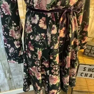 Lovely long sleeve dress with floral pattern. Features a flattering V-neckline and a purple velvet belted waist. Perfect for any occasion. Pit to pit is 20. Waist is 15 1/4 and length is 38. Bonus, this dress has pockets.