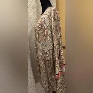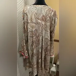 Pre owned. Food condition. Signs of use shown in pictures. Chic paisley blouse by JODIFL. Features a blend of cream, orange, and brown tones. Ideal for casual outings.