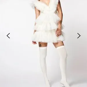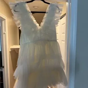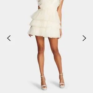 Betsey Johnson Cream Tiered Tulle Mini Dress Size Large. Perfect for special occasions. Romantic cream mini with a ruffled V-neck front and back. Airy tiered tulle skirt. Sleeveless. Mini length. Perfect for parties, bridal events, date nights, or holiday photos. Purchased on Poshmark. Excellent pre-owned condition. Smoke-free home.