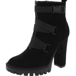Stylish black high heel ankle boots featuring strap details. Perfect for a chic look.