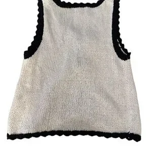 Chic ivory knit vest with dark edging. Features a front tie. Ideal for layering.