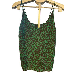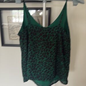 Chic camisole with a bold green and black pattern. Perfect for layering or wearing alone. The front of the cami is lined with opaque fabric, the back is sheer.