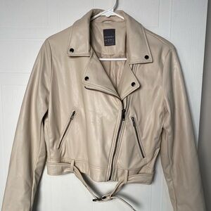 Stylish beige faux leather jacket with zipper details. Perfect for a modern look.