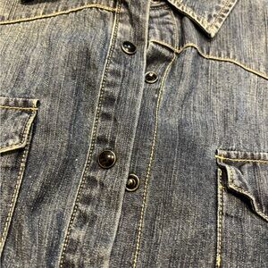 This is the Long-Sleeve Denim Button-Down Shirt by Nili Lotan x Target in a size XL. This is a western denim shirt from Lotan's special collection for Target in 2021. This is a 100 percent cotton shirt in Tribeca Wash, a soft, blue-black denim that is substantial but also light and breathable. It features nice detailing, including a classic yoke-seam design around the shoulders and snap buttons down the front and on the two front pockets. It is a well-designed classic denim shirt inspired by 1970s Americana that looks far more expensive than your usual Target shirt. Black pearl snaps