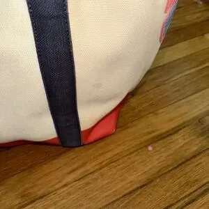 This stylish canvas tote bag features vibrant tropical leaf designs. Perfect for a day out, it combines functionality with a splash of color. The cream and red base is complemented by colorful leaf accents, making it a standout accessory.