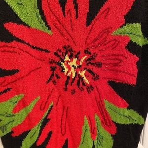 Stunning and vibrant red poinsettia flower embellished with sparkling beads on a stark black background. This sweater really pops! Lightweight cotton and ramie blend that has stretch. Ribbing around neckline, hem and armholes. This sweater is lightweight, so it would be perfect for holiday parties in a warmer climate, or for those crowded rooms with lots of people where it gets warm. Approximate measurements are in photos. Please review for an accurate fit.
