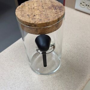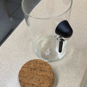 Clear glass jar with a cork lid. Features a coffee scoop.