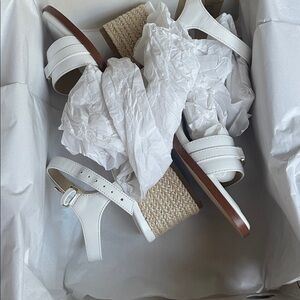 Chic white sandals with a tan woven heel. Stylish and comfortable. Ideal for any occasion.Smoke pet free home bin36B