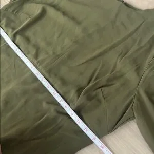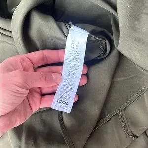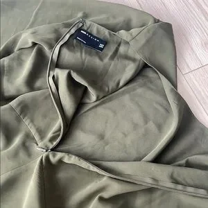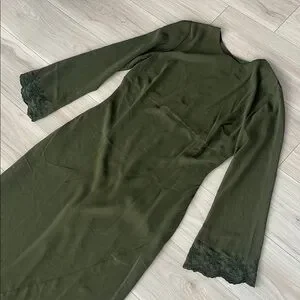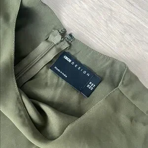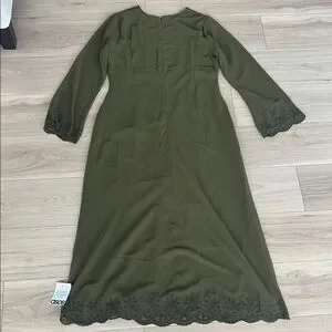 This ASOS dress in a rich green hue is perfect for wedding guests and cocktail events. It features long bell sleeves with a scalloped edge and a classic crew neckline. The sheath silhouette elegantly contours the body, offering a sophisticated and timeless look.