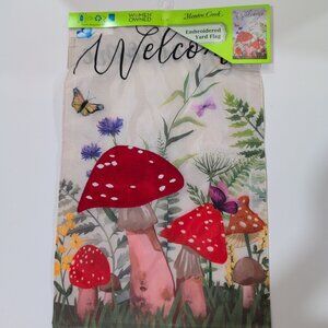 Brand new meadow Creek embroidered yard flag featuring red mushrooms plants and butterflies. Making this a beautiful flag for your garden in the spring and summer. Size of flag is 11 and 1/2 in wide by 18 in high. This is hand-stitched and 100% polyester.