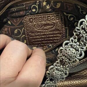 Unique and different leather handbag. Bronze and Gold with 3D floral pattern. Signature Brighton silver chain detail and silver heart hang charm. Top zipper closure. Inside is clean with beautiful pattern. Inner zip pocket. Height 6 Length 10 Handle drop. Approx 9