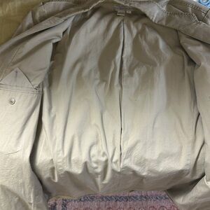 In excellent condition! One tiny spot under the collar (pictured). Not noticeable while wearing. Silk & cotton blend. Machine washable. Elongated, relaxed fit. Lining is cotton. Pockets on inside and outside are all functional.