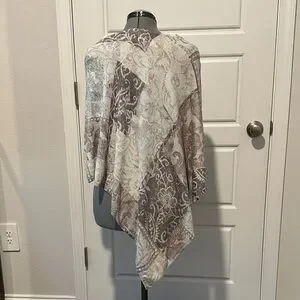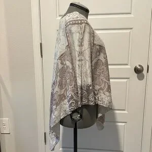 Elegant poncho with intricate patterns. Soft beige and brown tones. Perfect for layering. From smoke free home