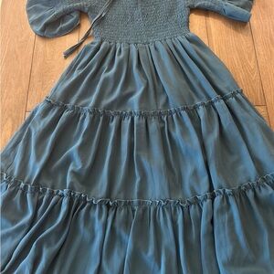Elegant blue dress with flowing tiered design. Ideal for formal events. Soft and graceful. There could be a small spot that’s not really noticeable but I would like to post just to be aware. Picture 11
