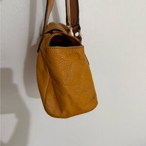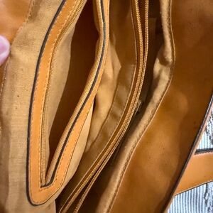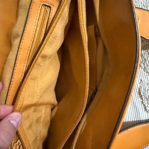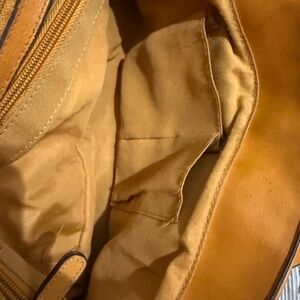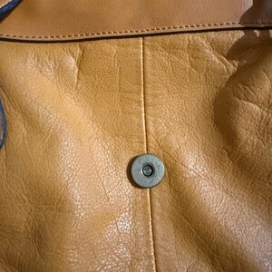 Unbranded 100% soft leather interior mustard yellow hobo bag. Inside features 2 zippered pockets and 2 open pockets. Brass hardware. Magnetic clasp on front under brass ring. Good condition, leather is intact.
