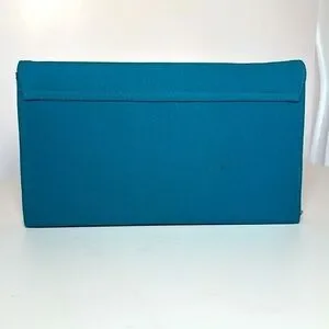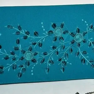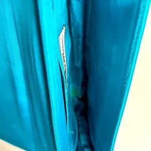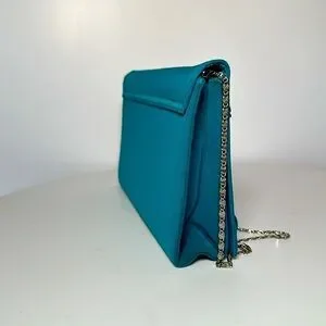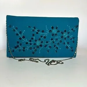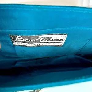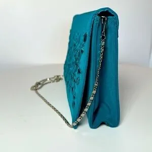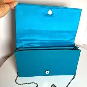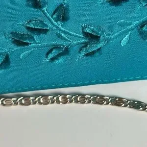 2012 Ben Marc International turquoise blue satin clutch. Silver chain at top size is 11" wide X 6 1/4" tall by 2" deep with beautiful embroidered stitching with velvet leaves, vines and flowers. note there are a couple little spots on the outside and a green spot inside on the bottom base. To me it looks like some glue color from when it was made. Pre-owned beauty.