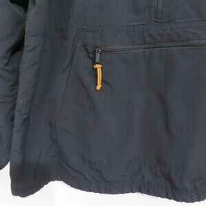 Classic L.L. Bean hooded pullover jacket in versatile black with signature yellow drawstrings. Windbreaker-style anorak features a front half-zip, large zip pocket, and lightweight construction — perfect for layering in transitional weather or throwing on for hikes, camping, or casual wear. A staple piece for outdoors, gorpcore, or normcore styling! Quilted lining.