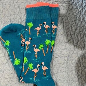 Vibrant socks featuring flamingos and palm trees. Perfect for adding a fun touch to your outfit.