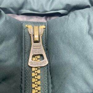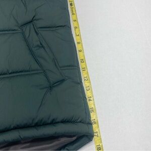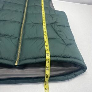 Stylish green puffer vest featuring a gold zipper. Perfect for layering. Great for all outdoor activities in cooler weather. Casual gorpcore minimalist