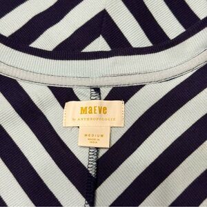 Anthropologie Maeve striped top size Medium, navy and pastel blue ribbed half sleeve blouse, zip front scoop neck top, stretch knit Anthropologie shirt, versatile casual chic workwear, NWOT new without tags Anthropologie style, classic and modern wardrobe essential, transitional spring fall layering piece, trendy yet timeless Anthropologie fashion.
