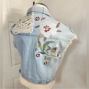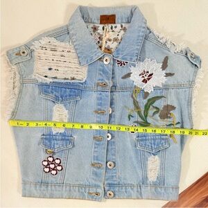 Amazing piece by POL!! Light blue denim vest with intricate floral embroidery, frayed edges and multi textured fabric distressing. Button closure.