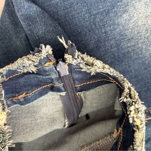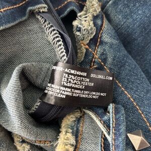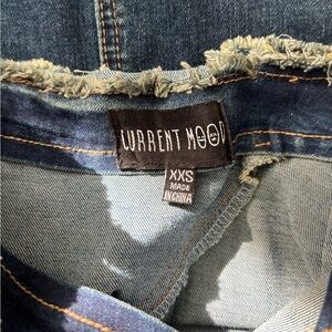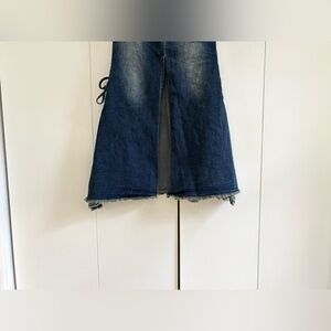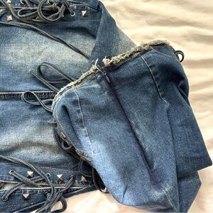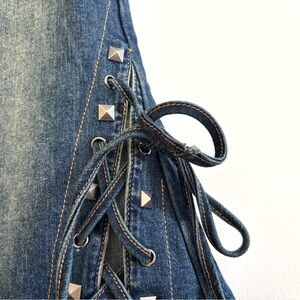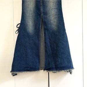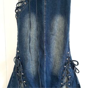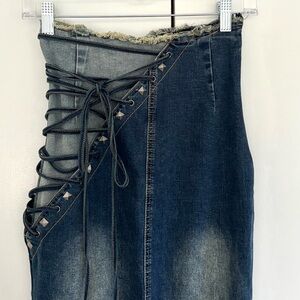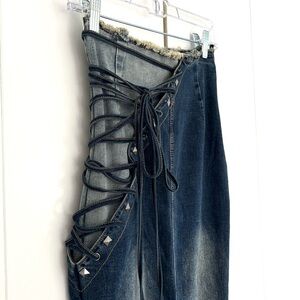 Dolls Kill Current Mood Misunderstood Tendencies Maxi Denim Mermaid Skirt. Lace up and tie design on the side of skirt and on front bottom. Stud detailing throughout. Raw hemline and waist. Distressed denim look. Side zipper, it comes off the waist, arrived like that (see photos). A rip on one of the front bottom tie strings (see photos). Slit up the middle of the back to help with movement. Has stretch to it. Worn a few times. Size XXS