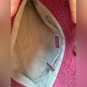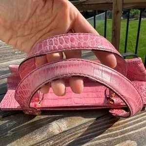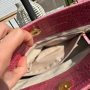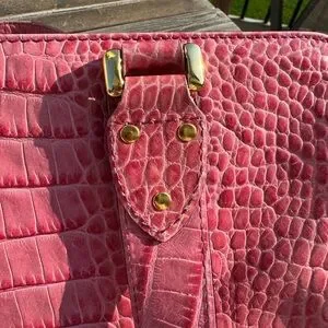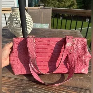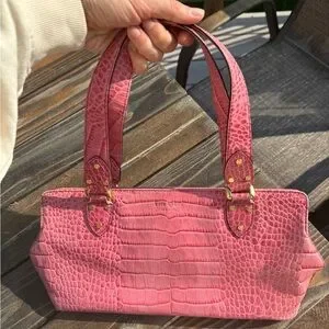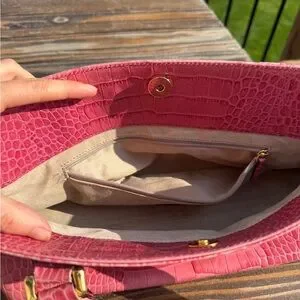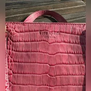 Pink Alligator Kate Spade mini bag with gold hardware. USED condition with decent wear/marks showing on handles, interior and some light marks on exterior. About 12 inches wide.