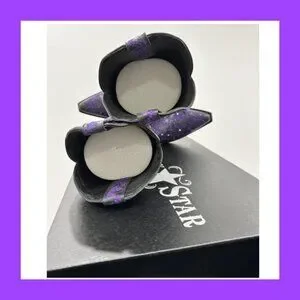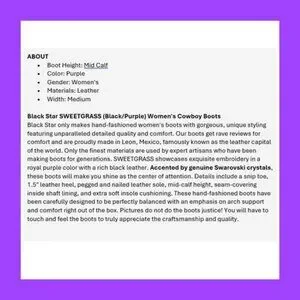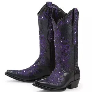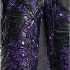 Boots are black leather with bright purple embroidery and genuine Swarovski crystals.