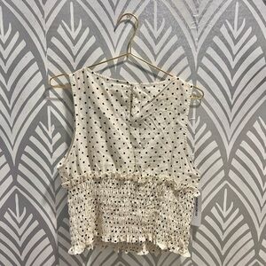 Elegant cream blouse with black polka dots. Features a smocked waist for a flattering fit.