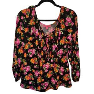Betsey Johnson Size Large Floral Blouse Tie-Front Neon Rose Print