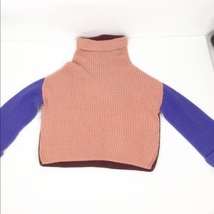 Stylish cowl neck sweater. Burgundy body with blue sleeves. Cozy and chic design.