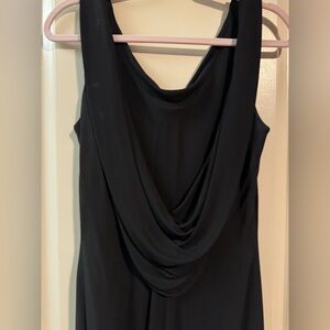 This elegant black sleeveless dress is perfect for any occasion. Its sleek design offers a timeless look. Draped low cut back, slit and scooped front. Size tag removed, measures size 4. 41 inches long.