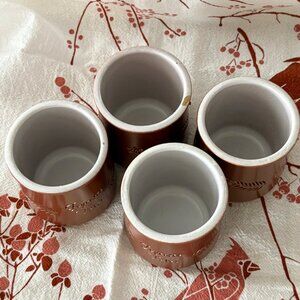 A set of (4) special-edition yogurt pots from La Fermière, a family-owned French yogurt and desserts company, born in sunny Provence in 1952. Their signature pots are lavender-blue – these were a holiday special two years ago, in a gorgeous softly-metallic color they call Bronze Gold. The inside and rims are glazed in snowy white.