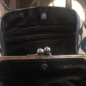 Elegant Coach shoulder bag with iconic pattern. Features black and gray colors. Perfect for everyday style. This pre-used bag is in great condition. There is normal wear on the inside with a few spots and a couple of spots on the outside as well. Please see photos for reference. This bag comes with the vintage Coach purse charm and a fabric/fur puff charm (not Coach).